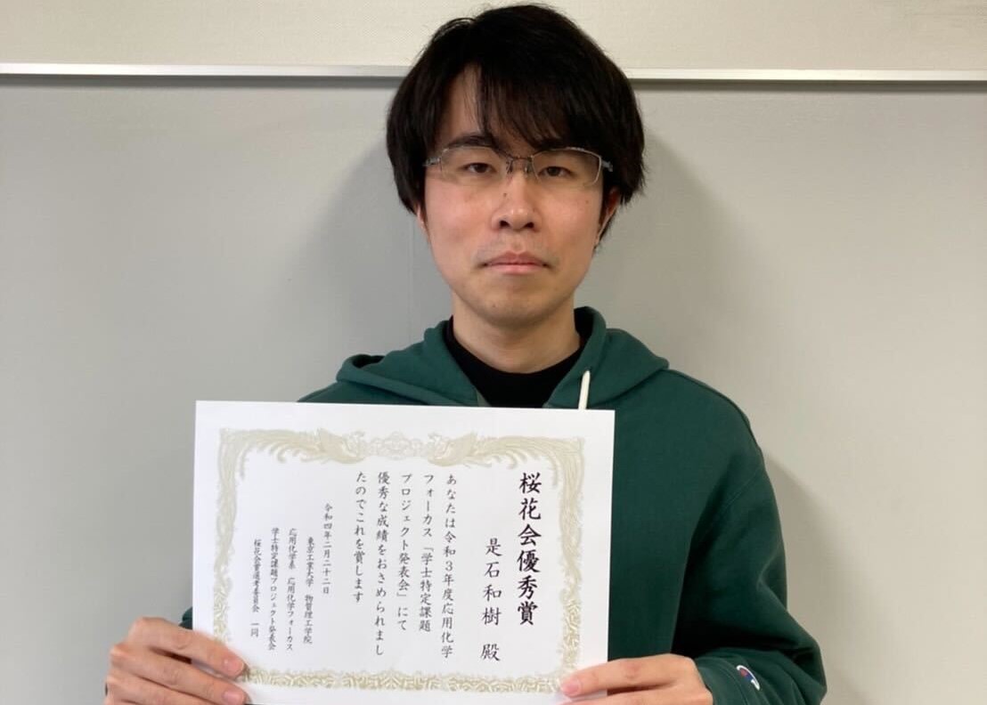 祝☆是石君が桜花会優秀賞を受賞しました! 投稿日: 2022年3月8日2026年1月28日 投稿者: ohtomolab 2022年2月22日 2月22日に学部4年生の小川さん,是石君,本田君,吉田君が各自の卒業研究をオンラインプレゼンテーションで紹介しました.是石君には桜花会優秀賞が贈られました. 優秀賞,おめでとうございます!そして,桜花会に心より感謝申し上げます.